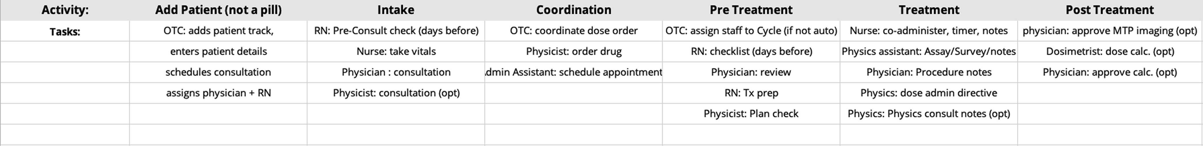 This is a clinical workflow application used by care teams to track a patient’s treatment journey end-to-end—planning, preparation, treatment delivery, monitoring, and follow-ups. The primary “racetrack” tracker view acts as a central hub, letting teams quickly scan what’s done, what’s pending, and what needs attention without jumping across multiple screens.